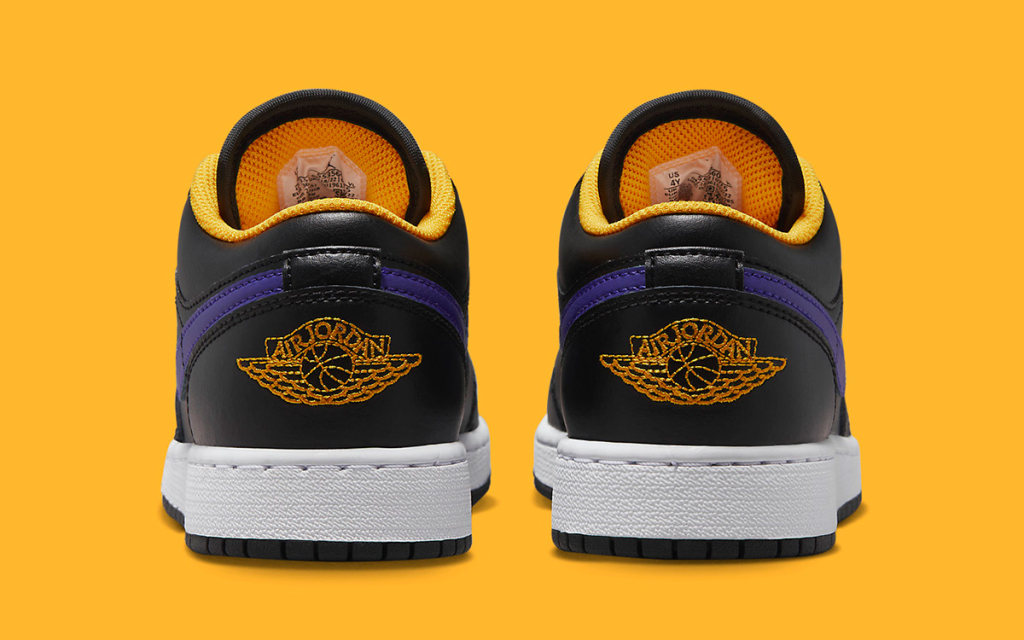 With key franchise colors of purple and gold forming the bulk, Jordan Brand has honored the Lakers home and alternate kits through solid black leather uppers, deep purple toe box and Swooshes, and striking pops of golden yellow along the liners and rear Wings motifs. All three colors converge on the tongue tag, with a bold strike of white along the midsole and black rubber outsole rounding out the design.