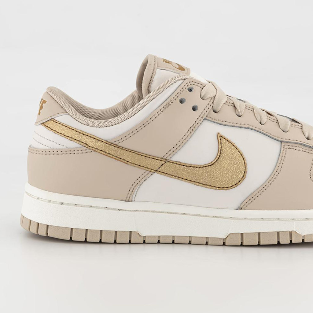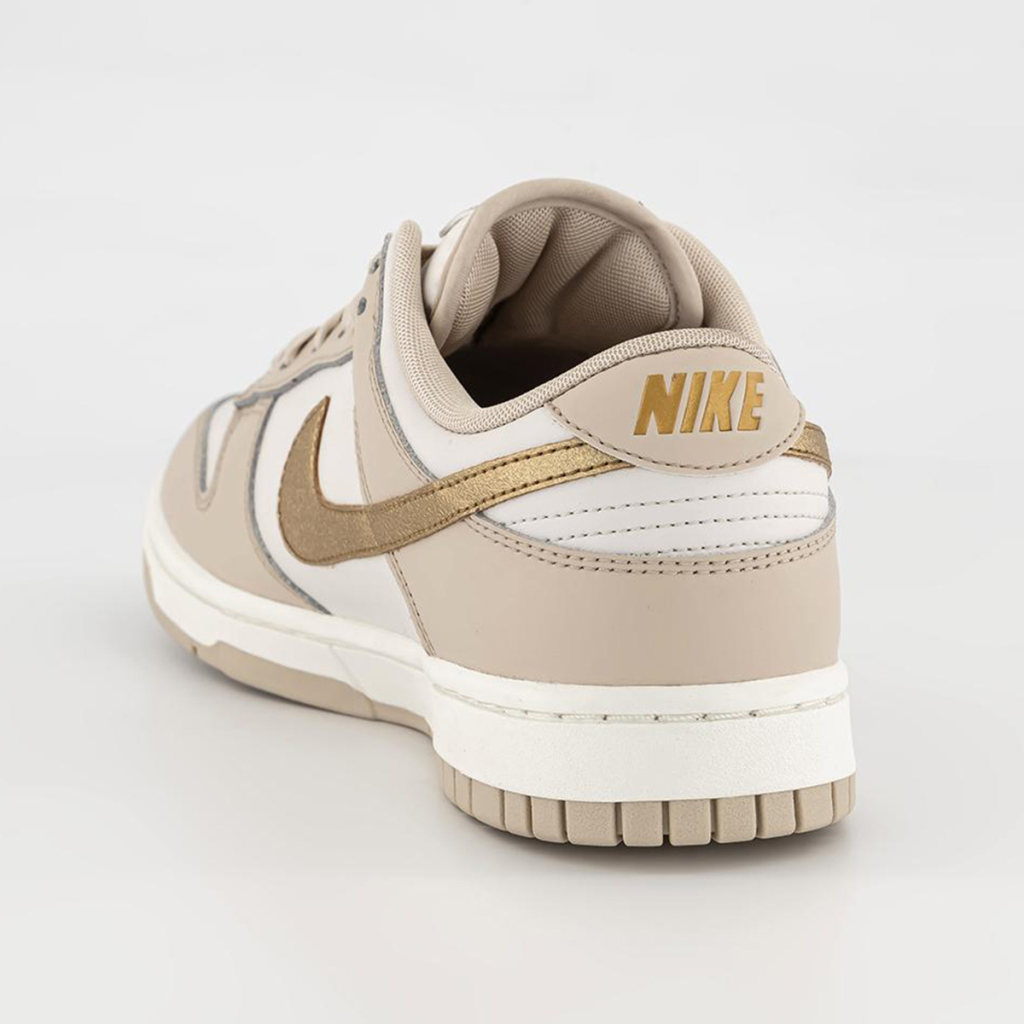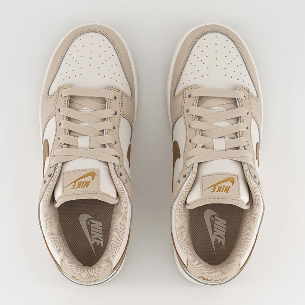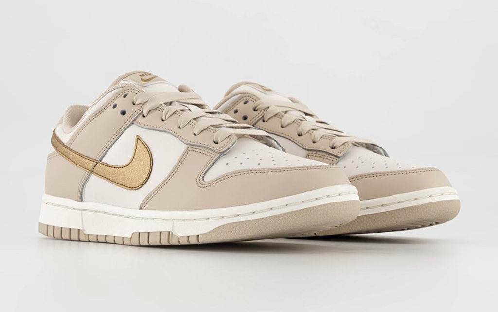 Though Fall footwear is often full of flax, suede, and triple black colorways, on occasion, brands entice us with something a little lighter. This new Nike Dunk Low “Gold Swoosh” does just that by adding seasonal tan hues to a summery white leather base — and it even adds a twist of glitz through golden accents.
