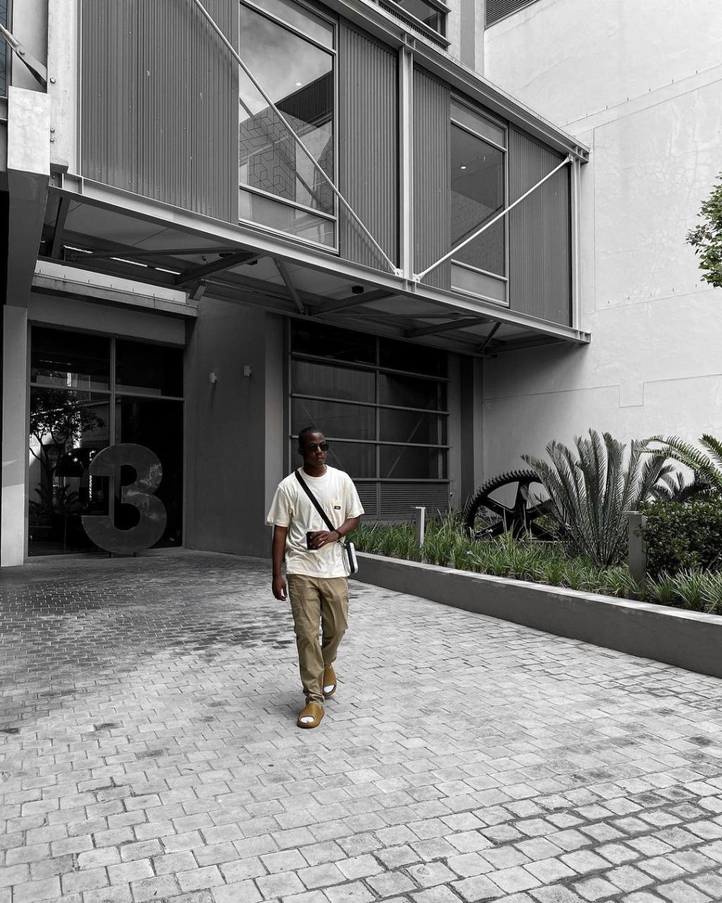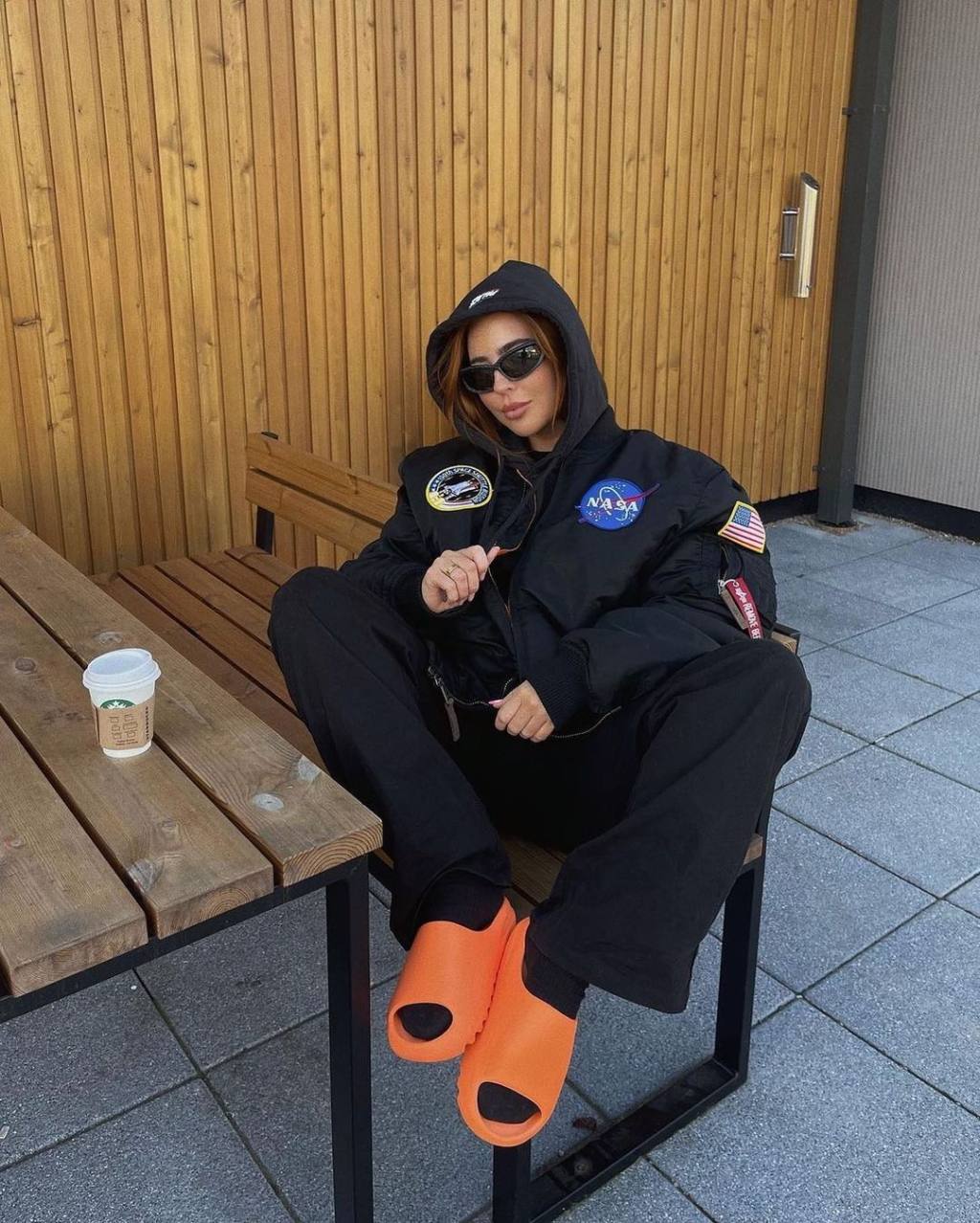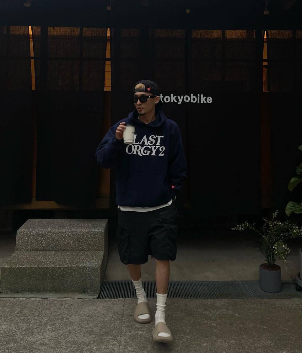 I style my resin Yeezy slides with comfy outfits. What I love about this fit is that the earth tones all match and everything is in perfect harmony. My cozy green hoodie matches the nineties shape beige shorts, it looks so lit! But the main piece of this outfit are slides and socks, they make everything look complete. To keep it bossy, I added a little detail with my vintage Dior necklace. Yeezy slides also look good with baggy jeans, alongside trackpants and more casual trousers too.