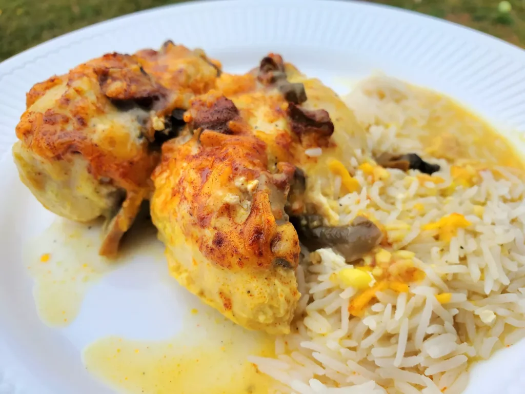 Layer the chicken breast halves into the bottom of a baking dish. Stir the cream of mushroom soup, mushrooms, garlic, curry powder, salt, and black pepper together in a bowl until mixed. Add the white wine to the soup mixture and stir until smooth; pour over the chicken breast halves. Sprinkle the Cheddar cheese and paprika over the mixture.