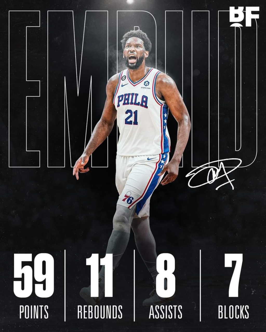 + Follow Lowe date 2022-11-14 11:15:35 Joel Embiid drops a CAREER-HIGH 59 PTS, 11 REB, 8 AST, 7 BLK on 68% FG as the 76ers beat the Jazz! Almost quadruple double! Joel Embiid drops a CAREER-HIGH 59 PTS, 11 REB, 8 AST, 7 BLK on 68% FG as the 76ers beat the Jazz! Almost quadruple double! 25 1 #Upcoming Shoes Comment(1) Please Sign in to comment Arc Antolin 2022-11-14 11:33:46 Reply 🔥
