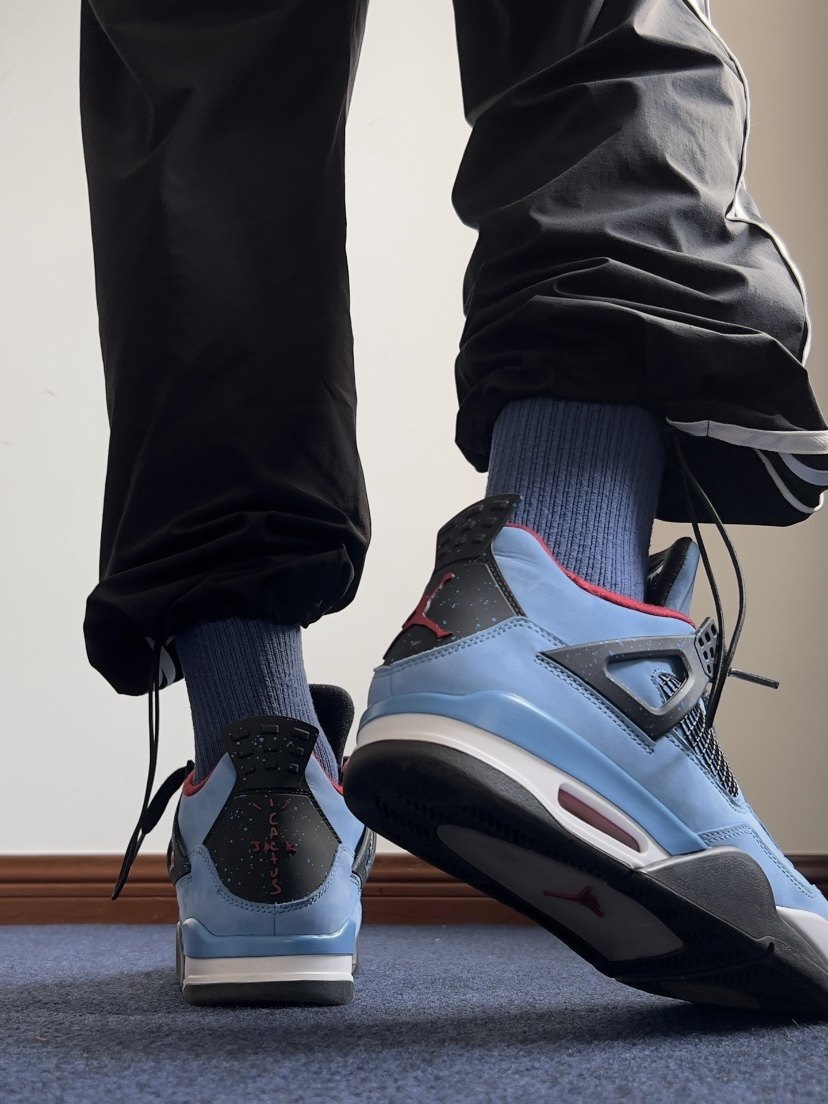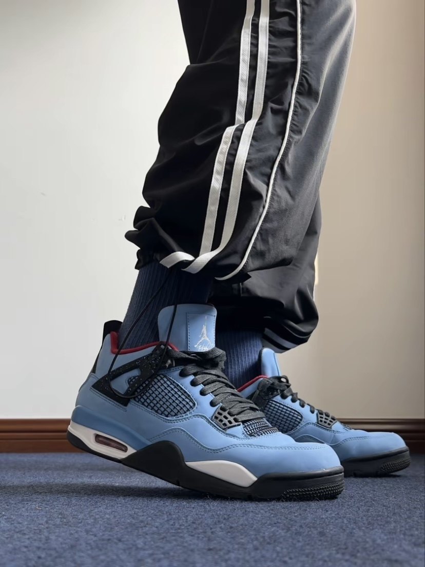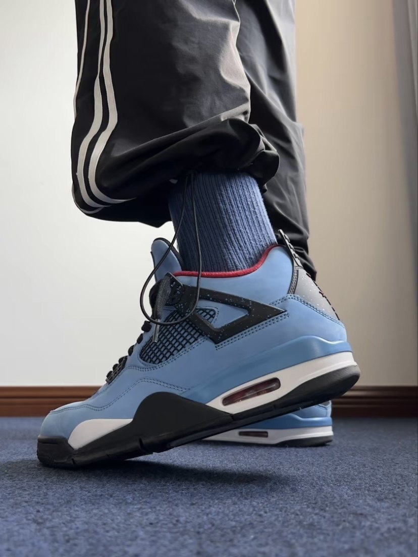 -aj4 ice blue color, blue upper, red lining has a strong contrast, very handsome, blue clothes and blue shoes, you can try the effect without scratching!