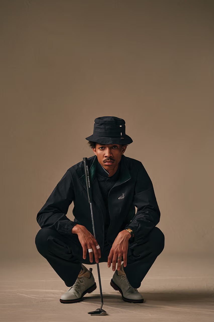 Adding to the lineup is a classic yet refined polo shirt, reminiscent of 90s golf fashion sported by legends like Tiger Woods and Mark O’Meara. Offered in navy or off-white, the micro diamond pattern across the torso sets a stylish tone, accentuated by knit cuffs and a tipped collar for a polished finish.