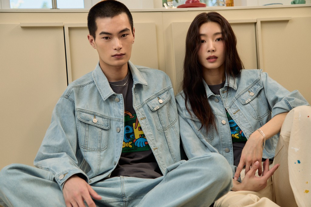 Lee's iconic denim pieces make a strong appearance, including the classic knight jacket updated with a light blue washed texture. The jacket features the KARORO rabbit patch with a brushed finish on the back, blending retro, streetwear, and casual styles seamlessly.