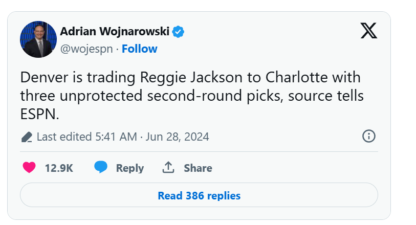 Hornets to acquire Reggie Jackson from NuggetsThe Denver Nuggets have agreed to send guard Reggie Jackson to the Charlotte Hornets in exchange for three unprotected second-round picks, according to ESPN’s Adrian Wojnarowski.