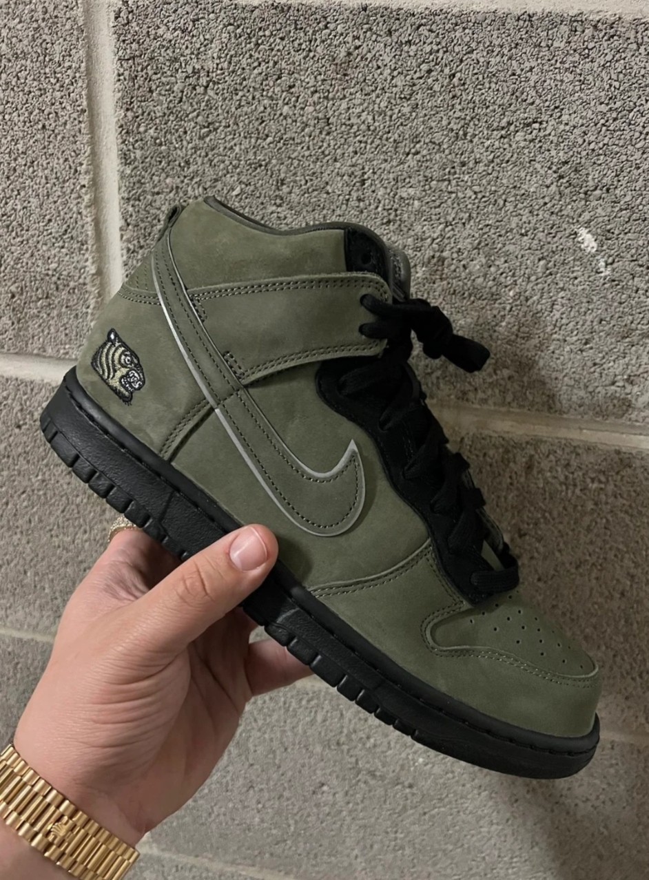 Recently, the team lent its creative vision to the Nike SB Dunk High, a silhouette that’s recently emerged in handfuls of compelling styles courtesy of independent skate shops from across the globe. For its first-ever take on the late Peter Moore’s 37-year-old design, SOULGOODS abandoned the bold, all-over print of its Converse collaboration from May 2021 in favor of an understated olive green and black ensemble. The crew’s “灵魂虎” (Soul Tiger) graphic is embroidered onto the lateral heel, and stamped on both the top of the tongue and sock-liners. Although the all-black mesh tongue (and surrounding panels) and sole units differentiate the Chinese label’s Nike SB offering, the most distinguishing factor on the pair is the “FROM BEIJING TO THE WORLD” text placed on the inside of the collar, showcasing SOULGOODS’ national pride and plans to leave its mark on the world.